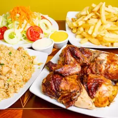 1 Pollo, papas, ensalada, cremas y chaufa.