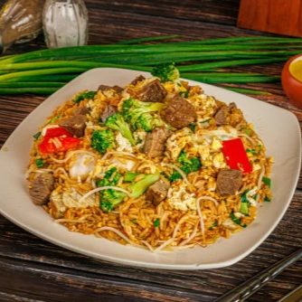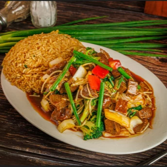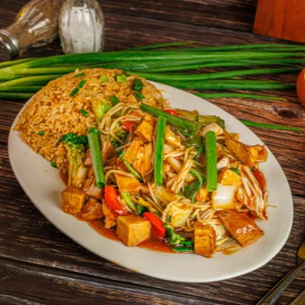 Arroz chaufa, tallarín chino y pollo con verduras.