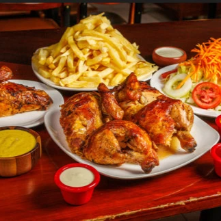 1 Pollo, papas, ensalada, cremas y 1/4 de pollo.