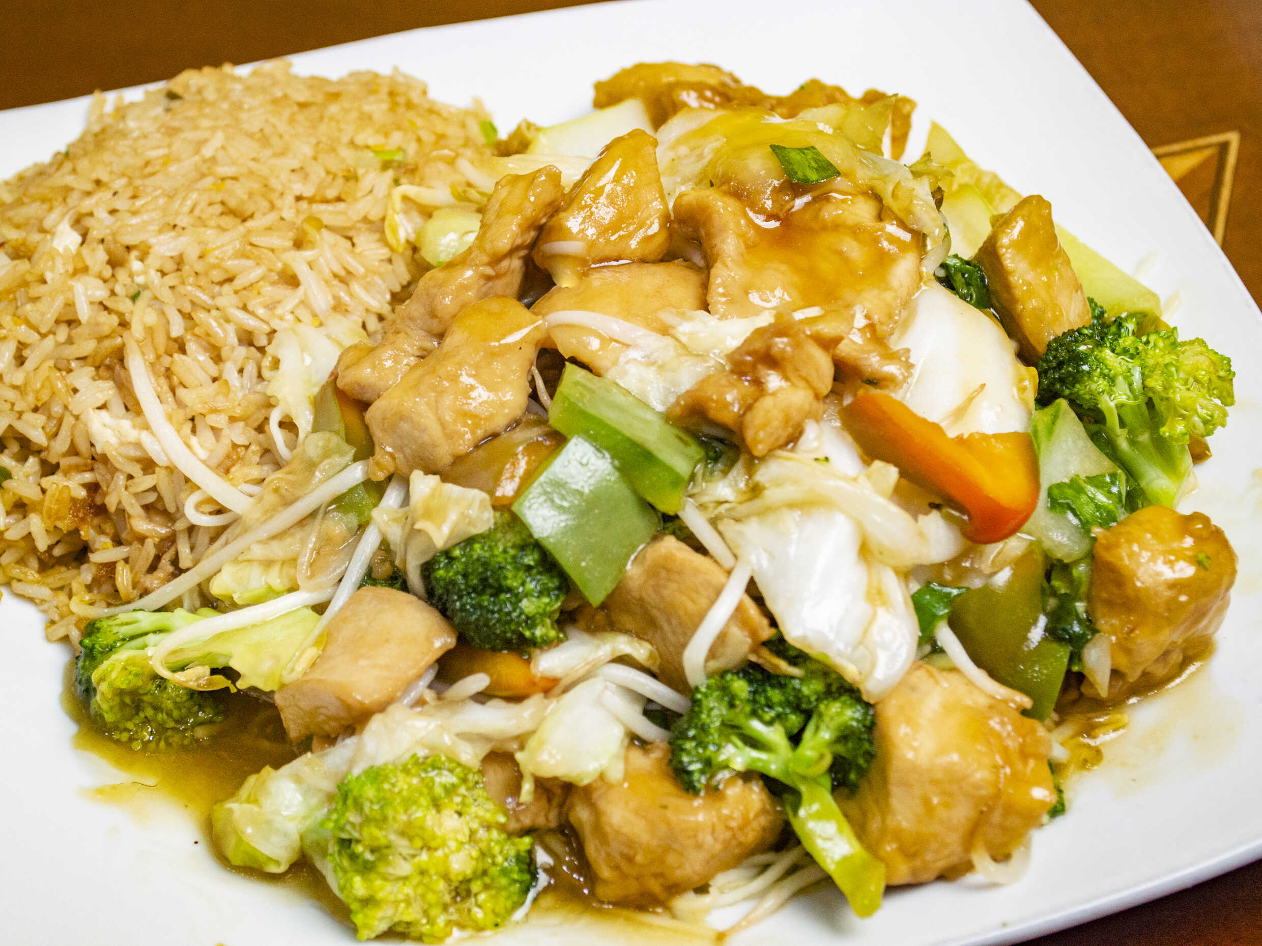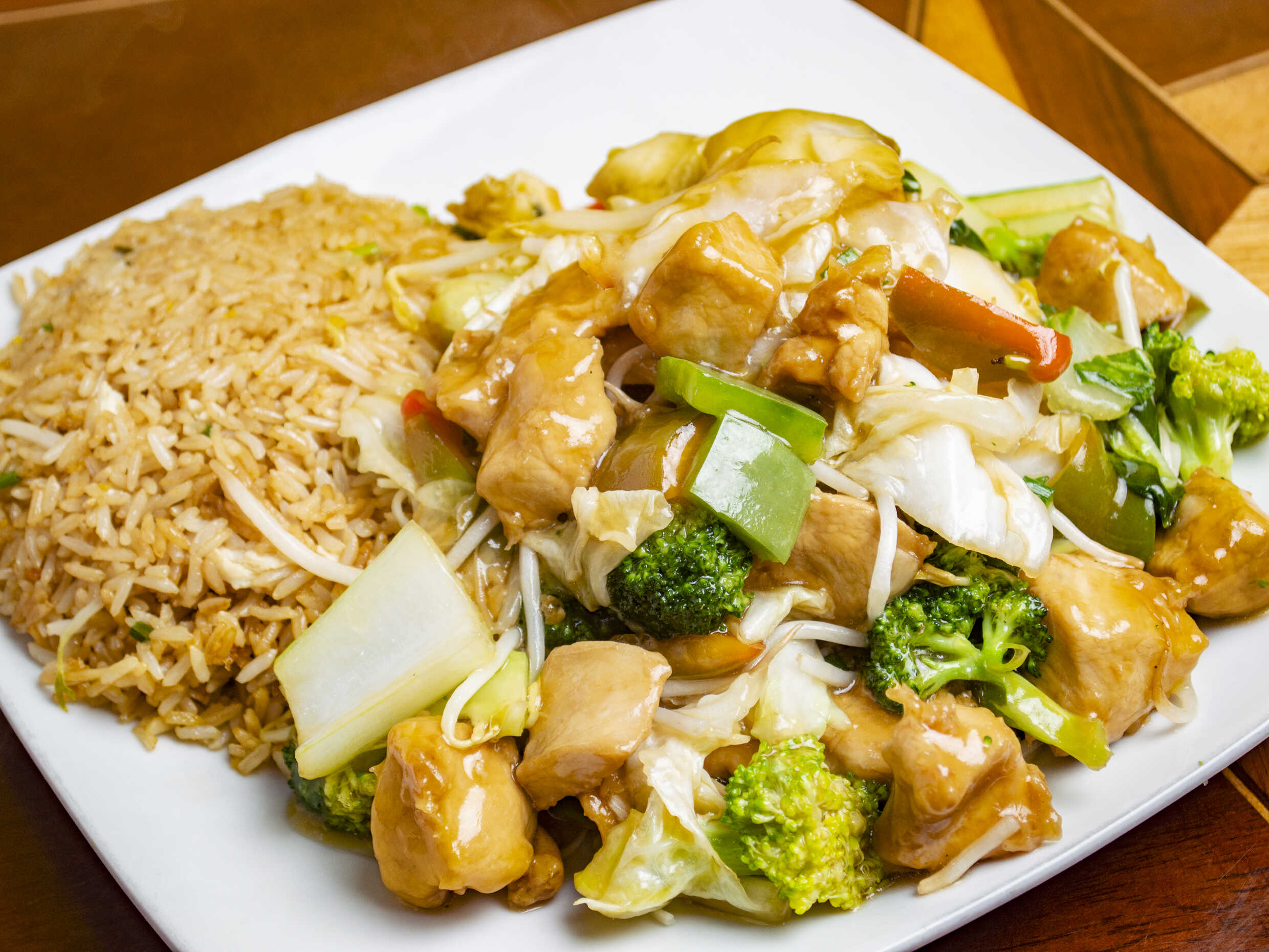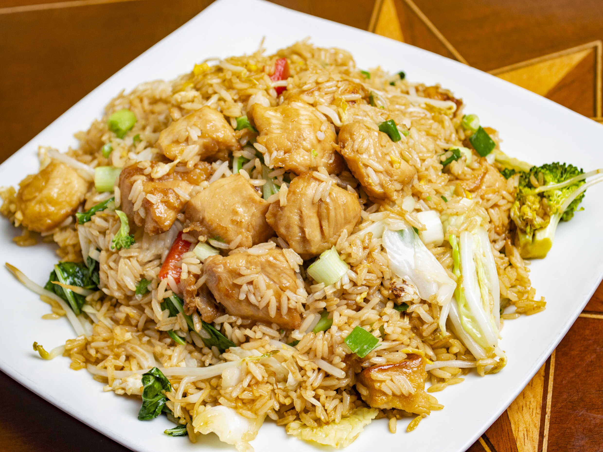 Arroz chaufa con pollo y verduras.