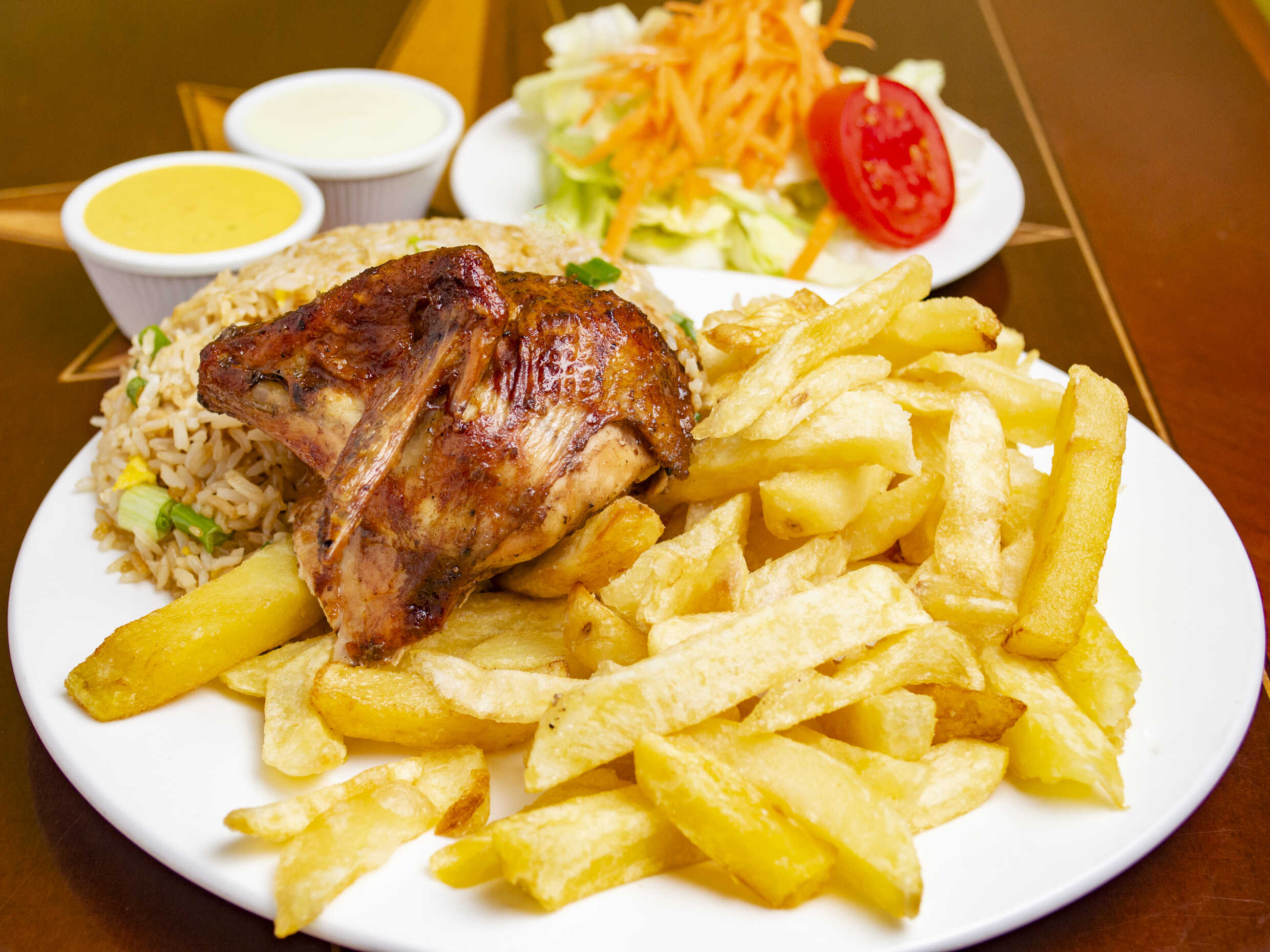1/2 Pollo a la Brasa con Papas, Ensalada y Chaufa