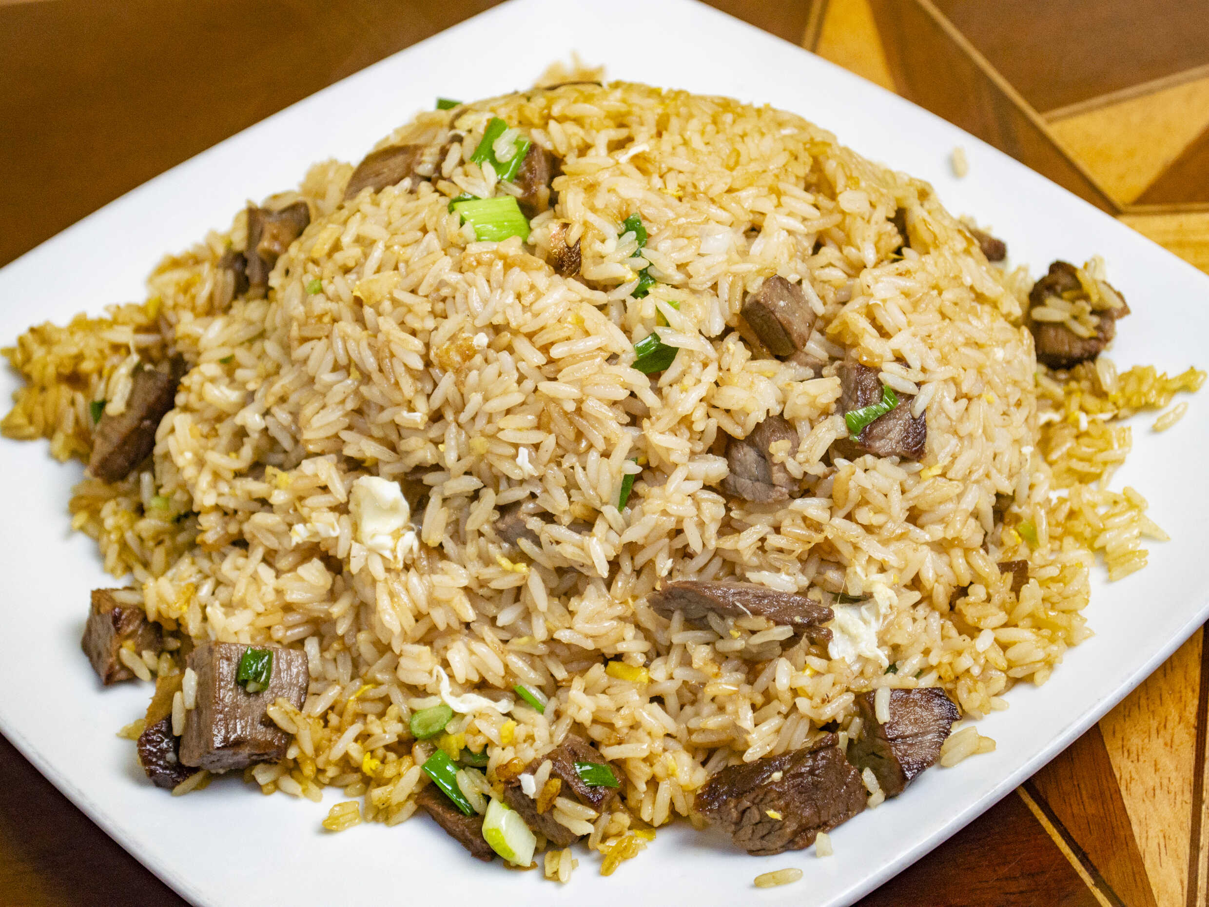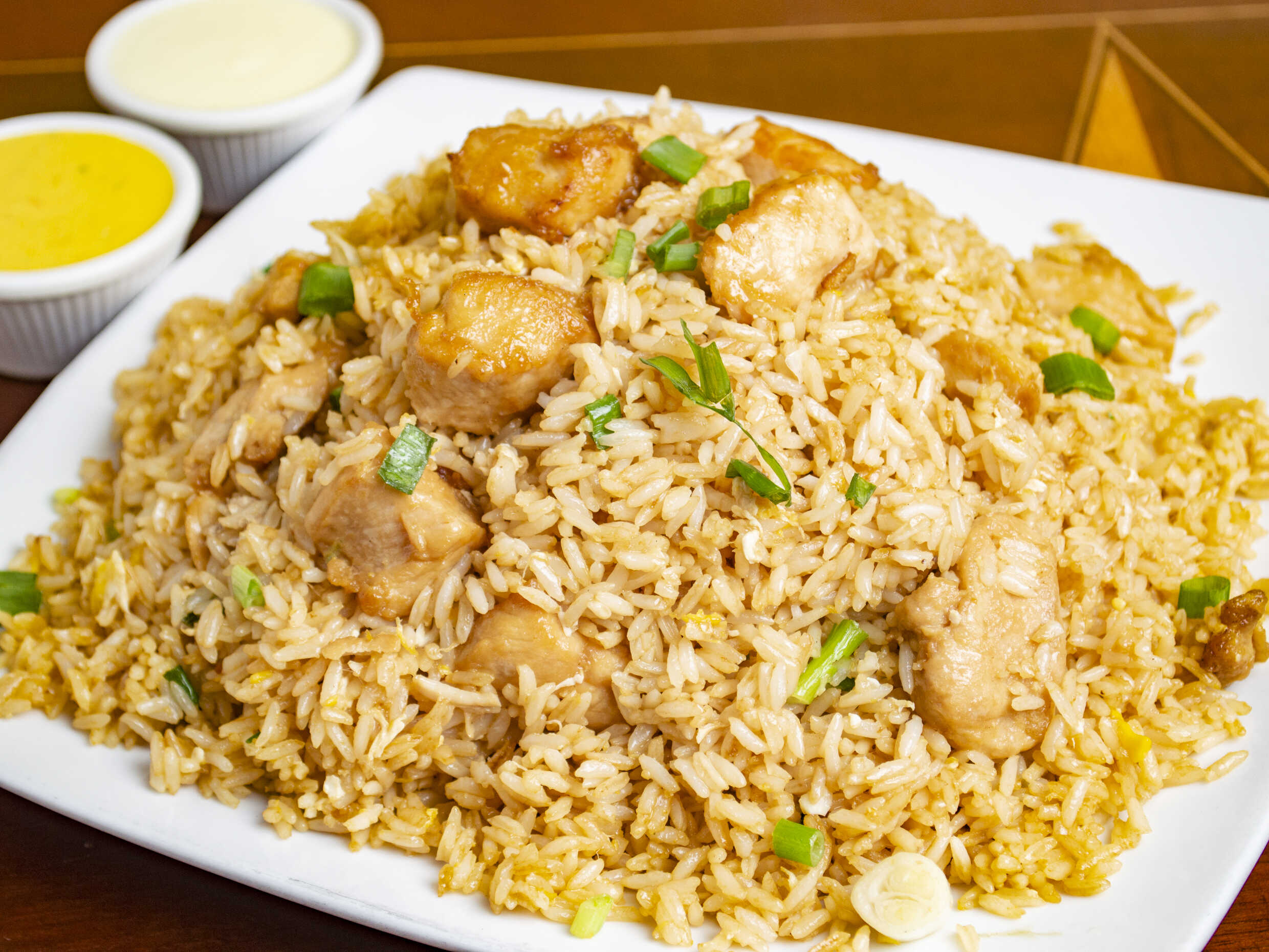 Arroz chaufa de pollo, cebollita fina y huevo.
