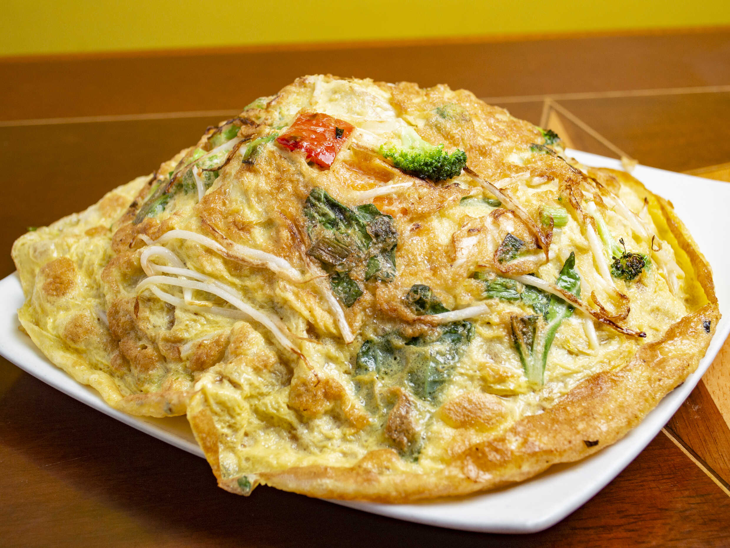Arroz chaufa con tortilla de huevo y verduras.