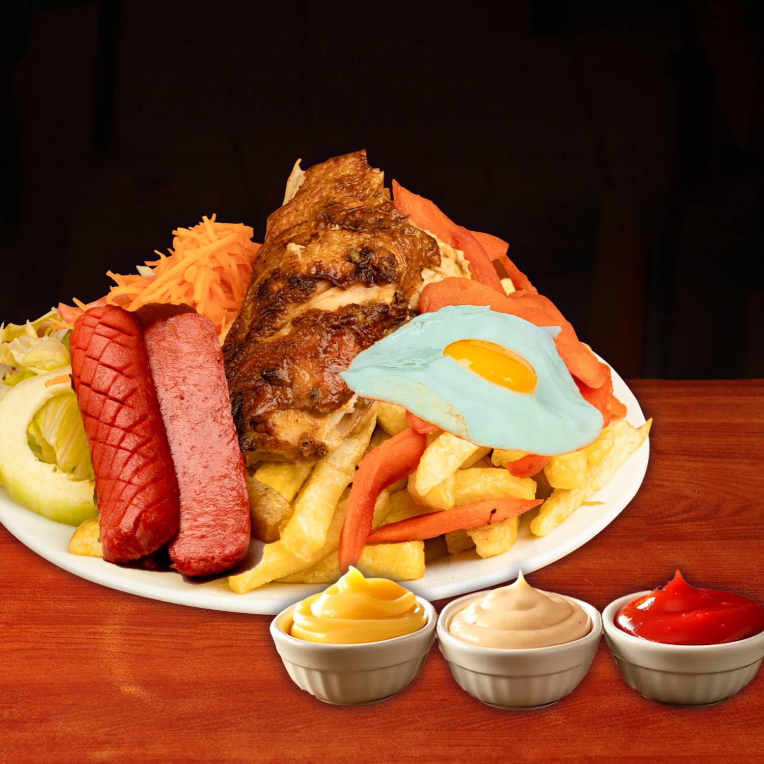 Hot dog ahumado, 1/4 de pollo, 1 chorizo, 1 huevo frito, crocantes papas fritas y ensalada con cremas.