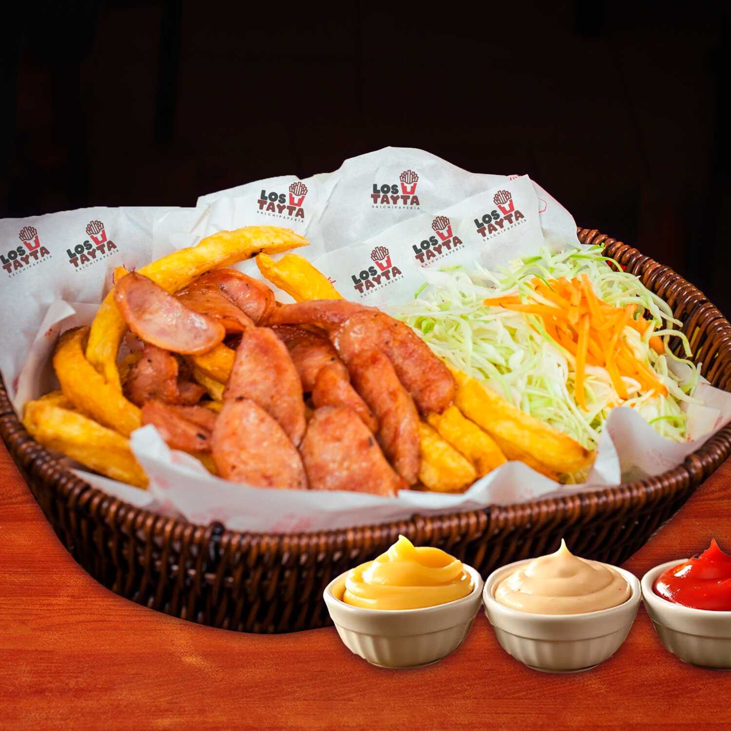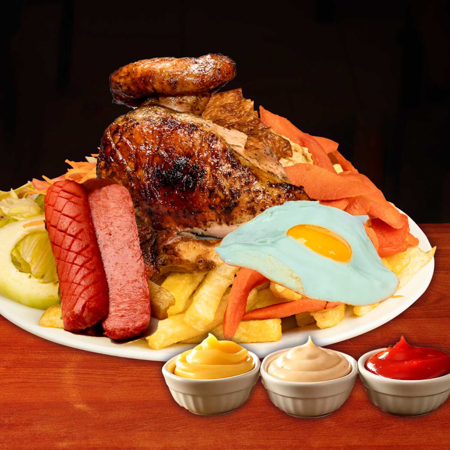 Hot dog ahumado, 1/8 de pollo, 1 chorizo, 1 huevo frito, crocante papas fritas y ensalada con cremas.