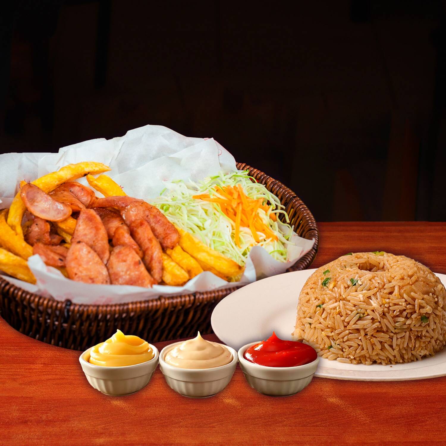 Hot dog ahumado, arroz chaufa de pollo, crocantes papas fritas y ensalada con cremas.