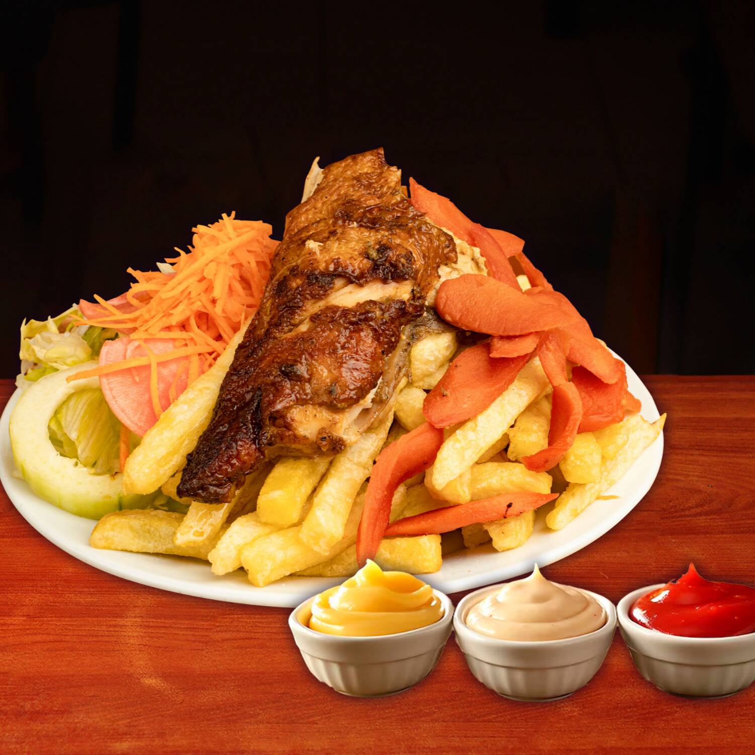 Hot dog ahumado, 1/8 de pollo, crocantes papas fritas y ensalada con cremas.