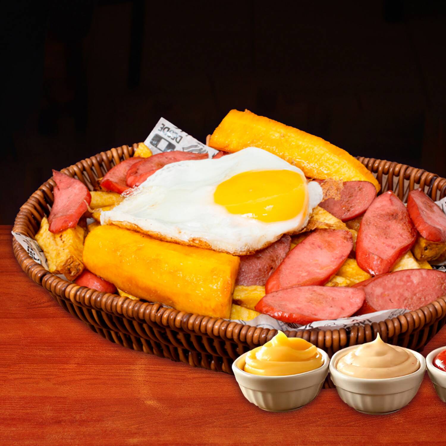 Hot dog ahumado con 1 huevo frito, 1 plátano frito, crocantes papas fritas y ensalada con cremas.