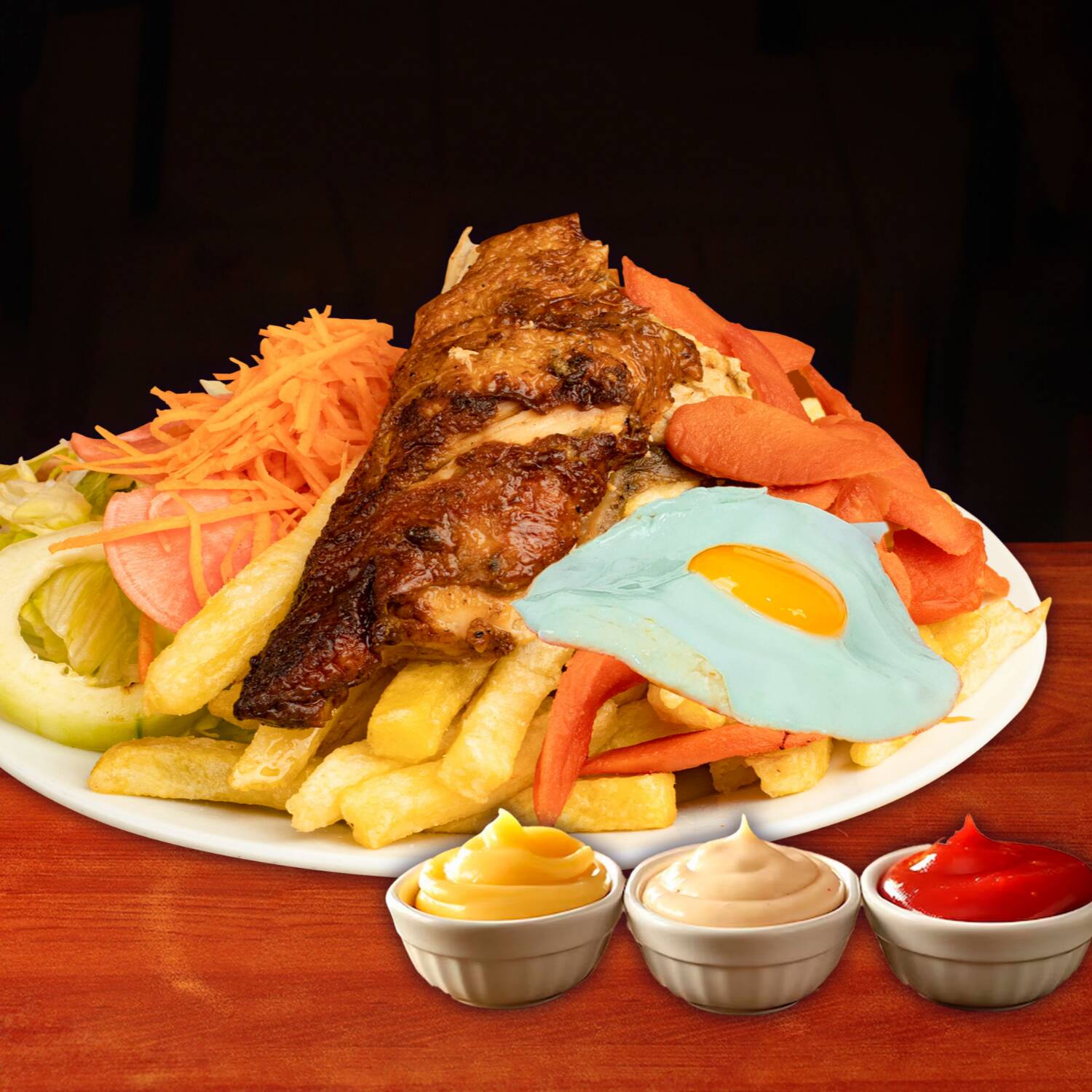 Hot dog ahumado, 1/8 de pollo, 1 huevo frito, crocantes papas fritas y ensalada con cremas.