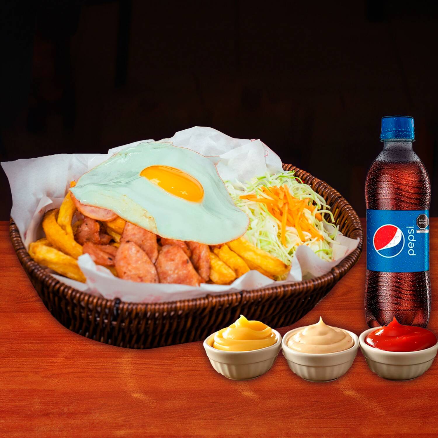 01 salchipapa de la montada + 01 Pepsi 355 ml.