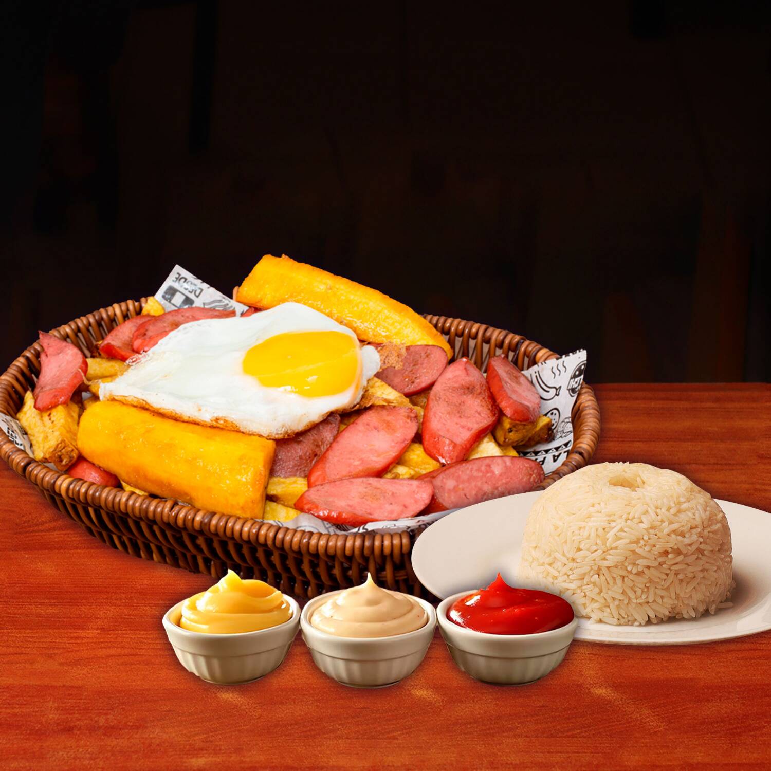 Hot dog ahumado, arroz blanco, 1 huevo frito, plátano frito, crocantes papas fritas y ensalada con cremas.