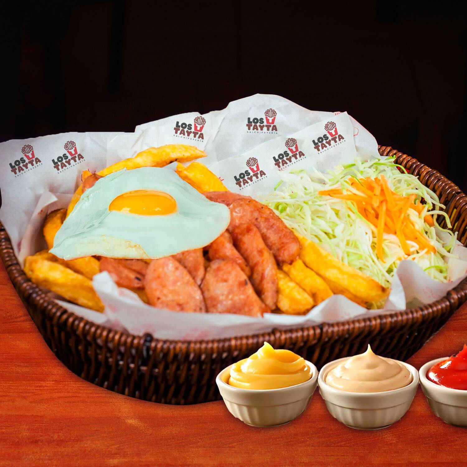 Hot dog ahumado con chorizo, 1 huevo frito, crocantes papas fritas y ensalada con cremas.