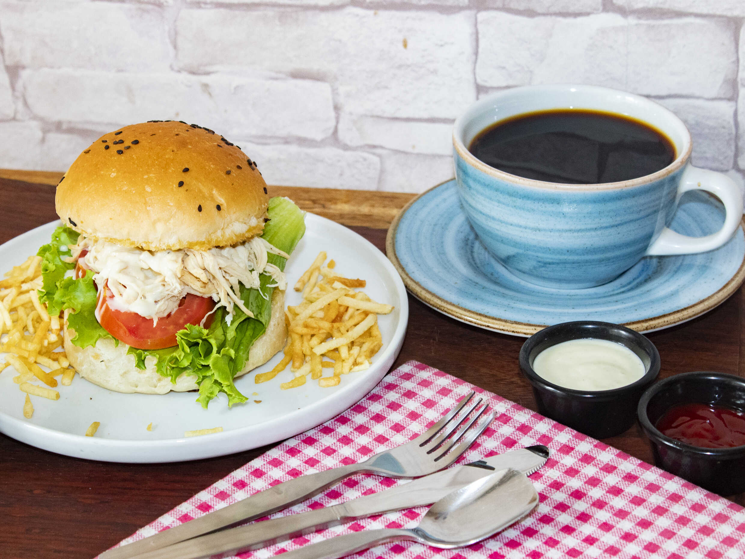 Sándwich de pollo deshilachado, papas al hilo, tomate, lechuga en pan brioche.