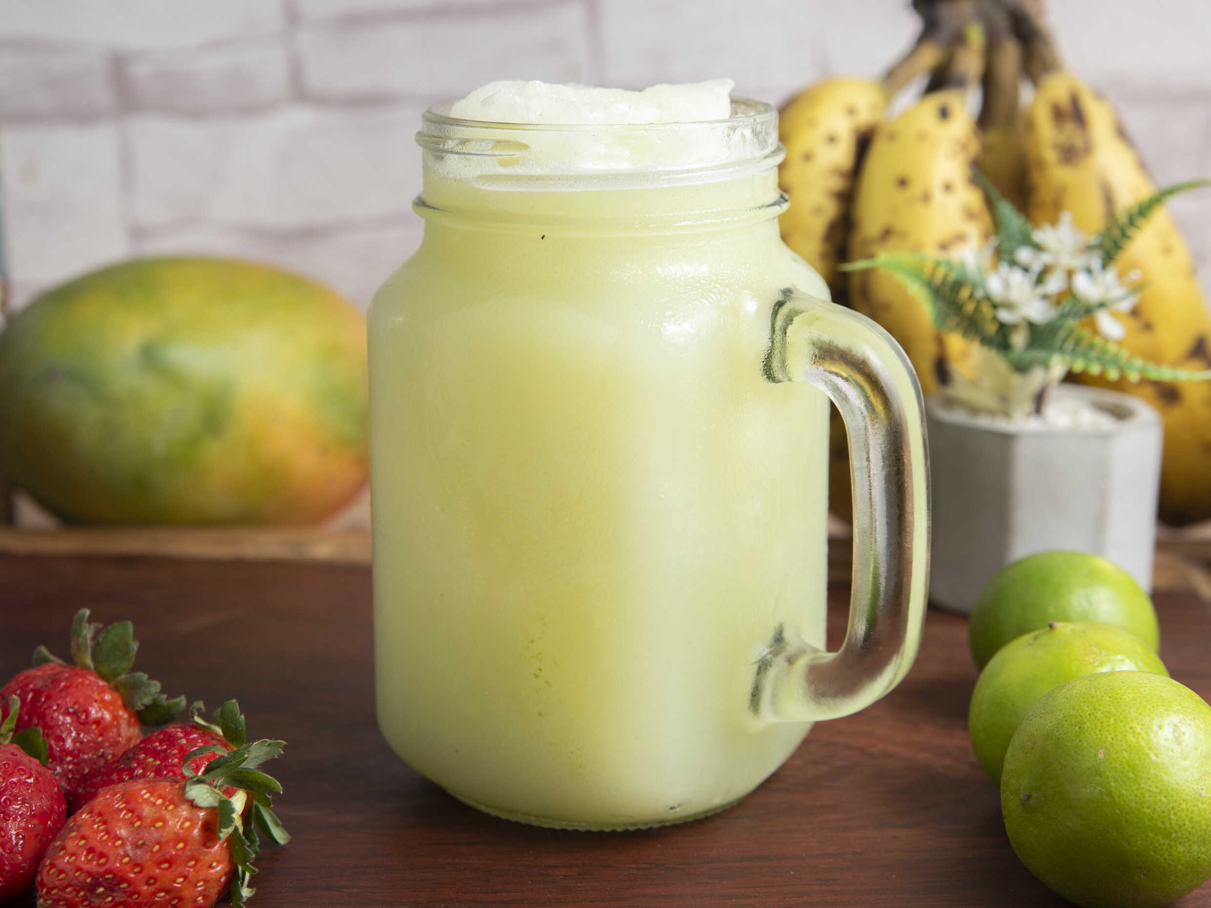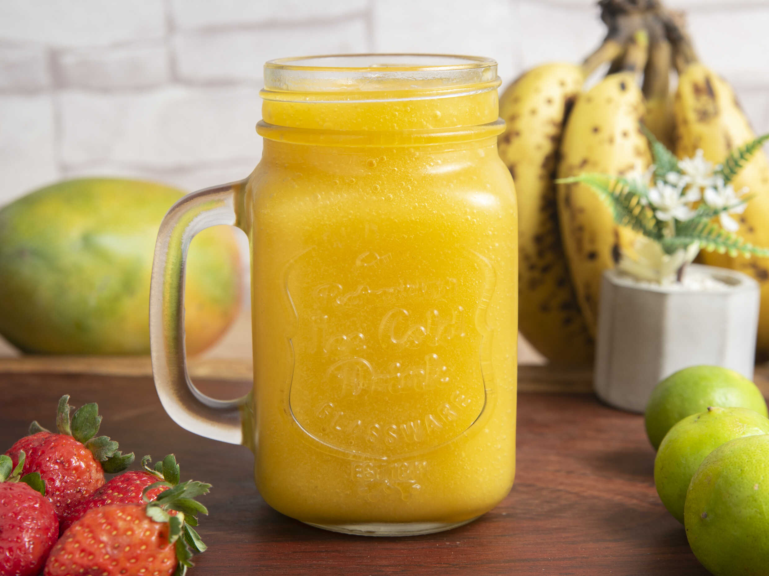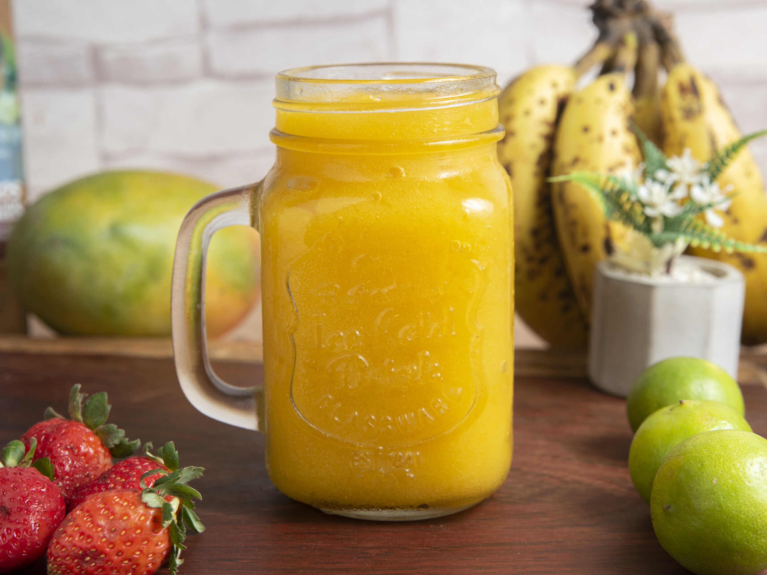 Batido de manzana, papaya, platano, huevo, algarrobina y leche fresca vaso 16 oz. (no usamos sorbetes para los jugos).