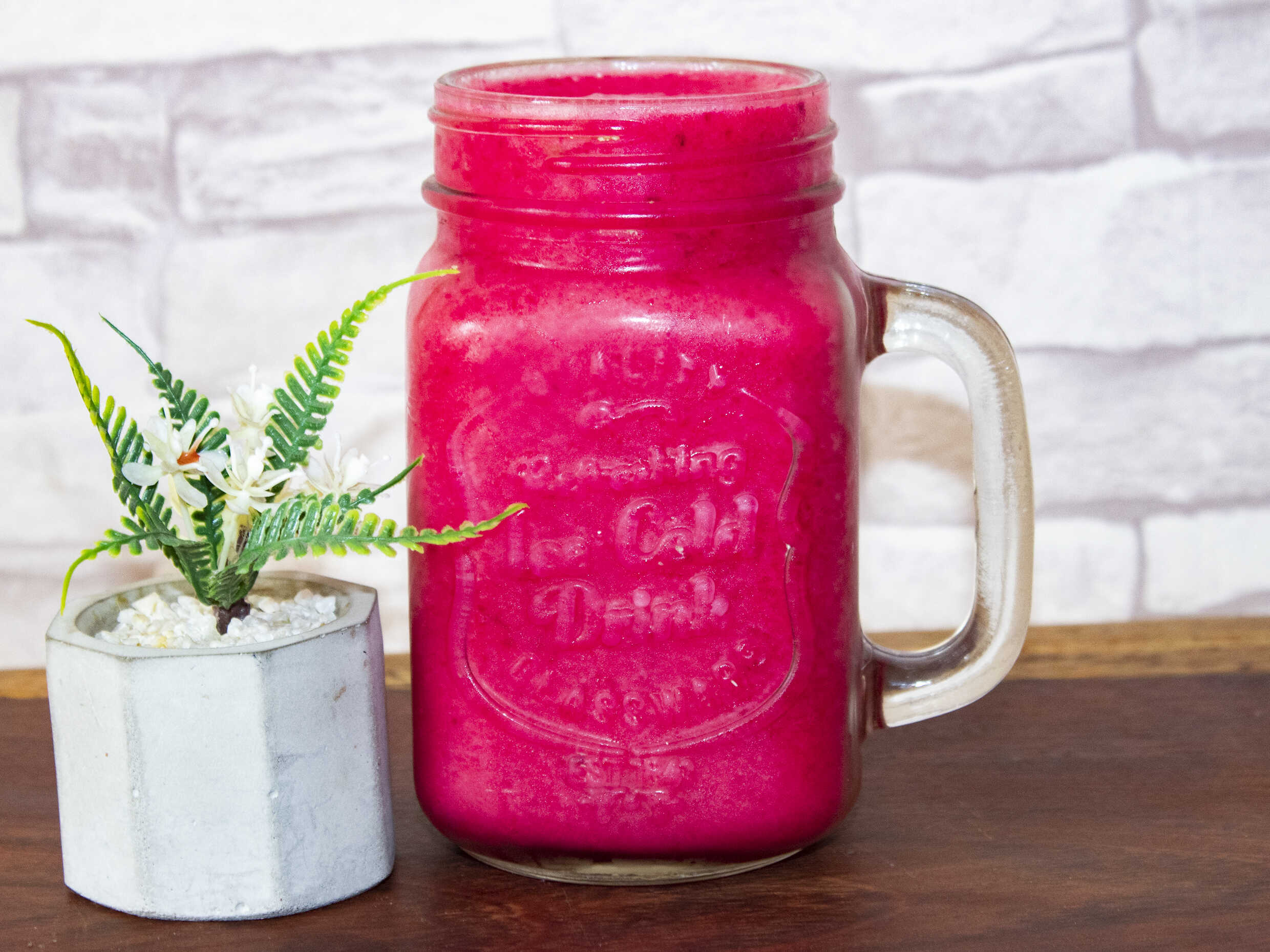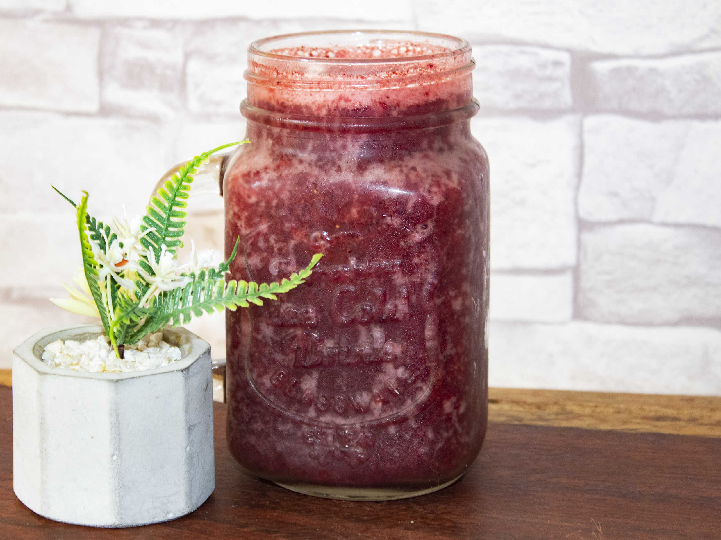 Jugo con papaya, piña, manzana y betarraga, de 16 Oz. (no usamos sorbetes para los jugos).