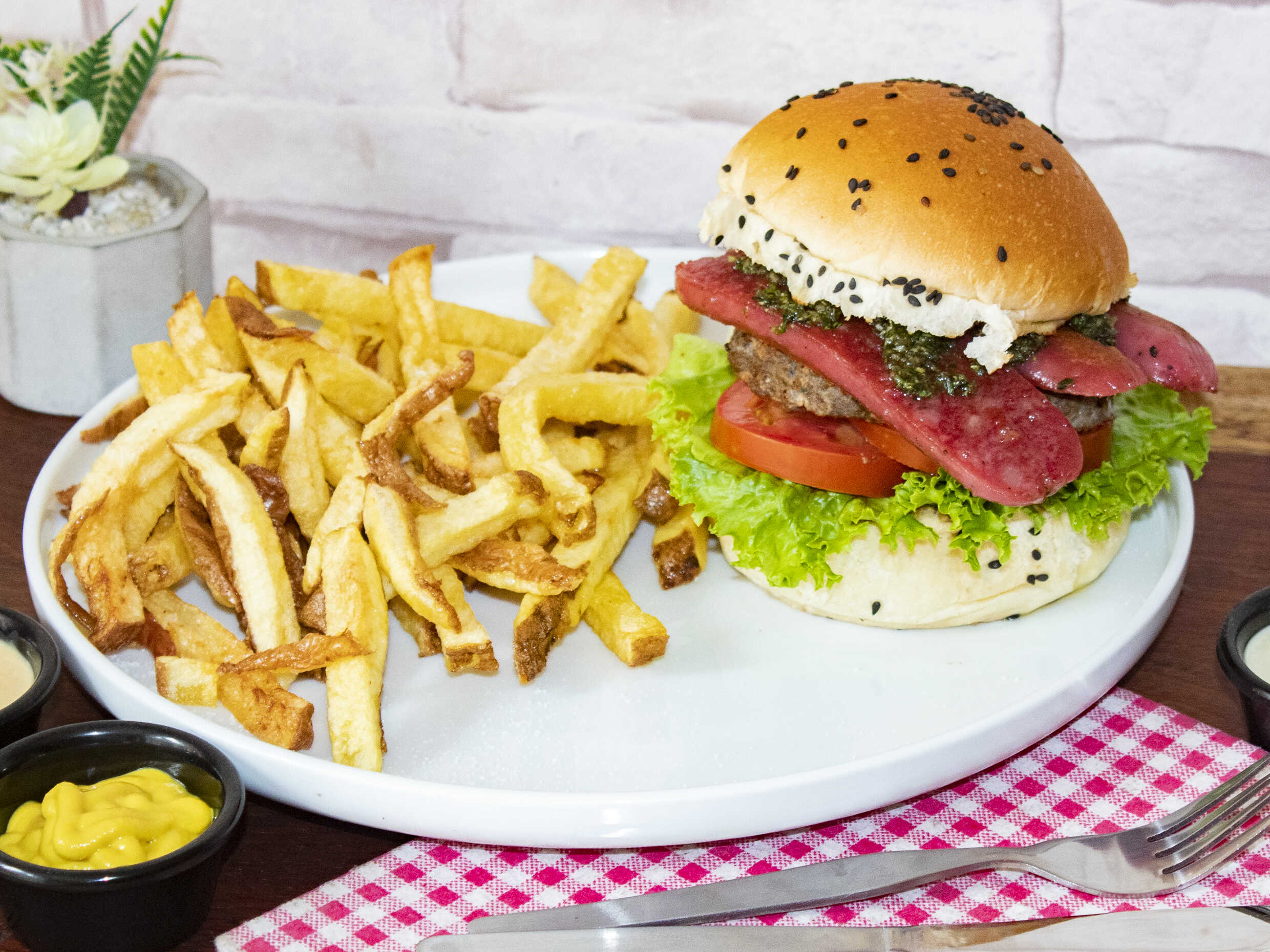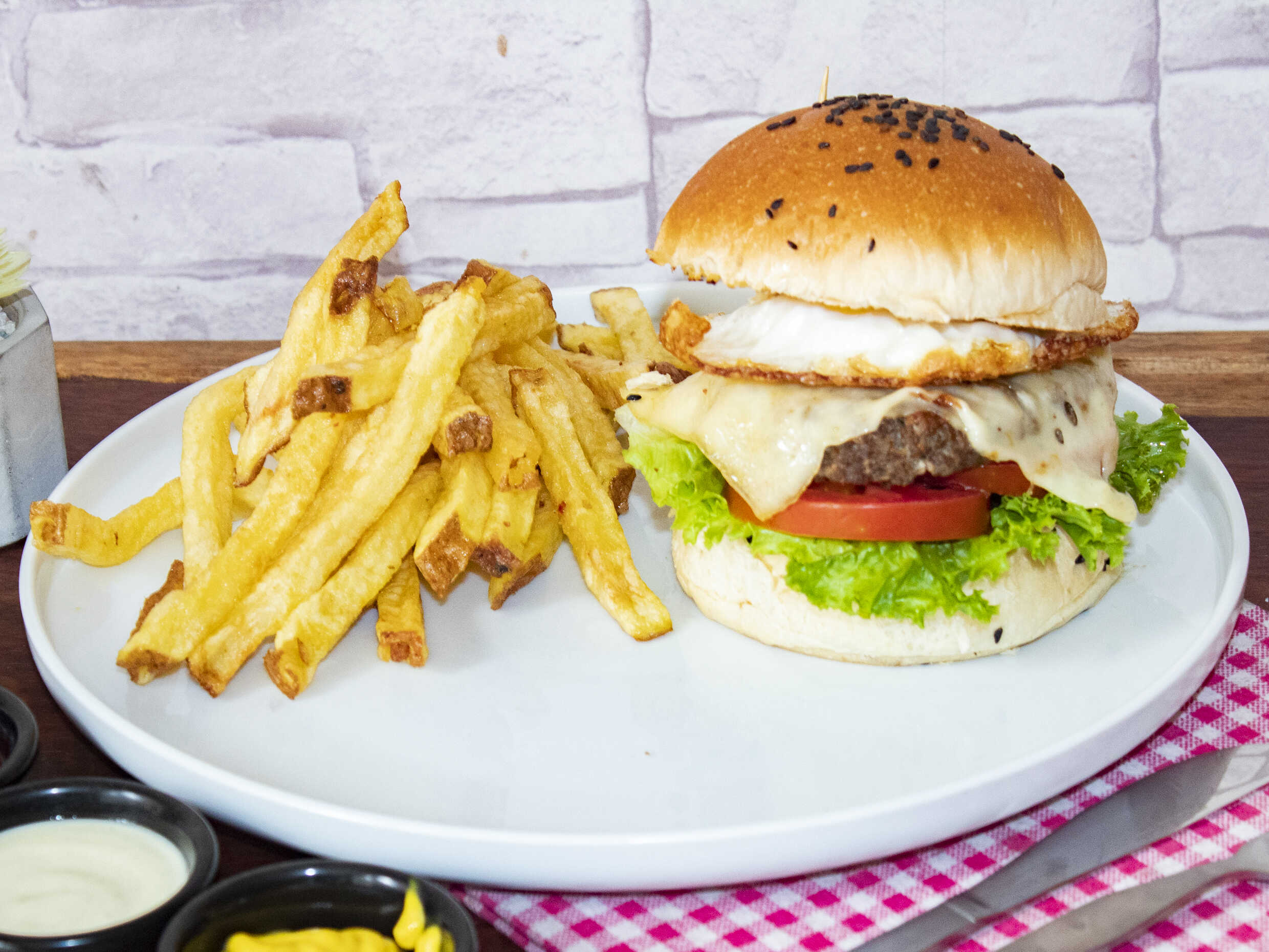 Hamburguesa de carne, con queso dambo, jamon, ingles, huevo frito y tocino lechuga y tomate, acompañado de papas fritas.
