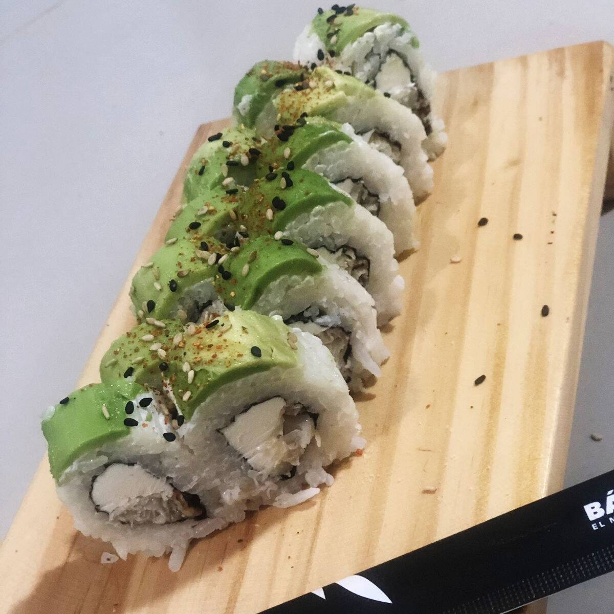 Palta y pescado furai cubierta de salsa de guacamole