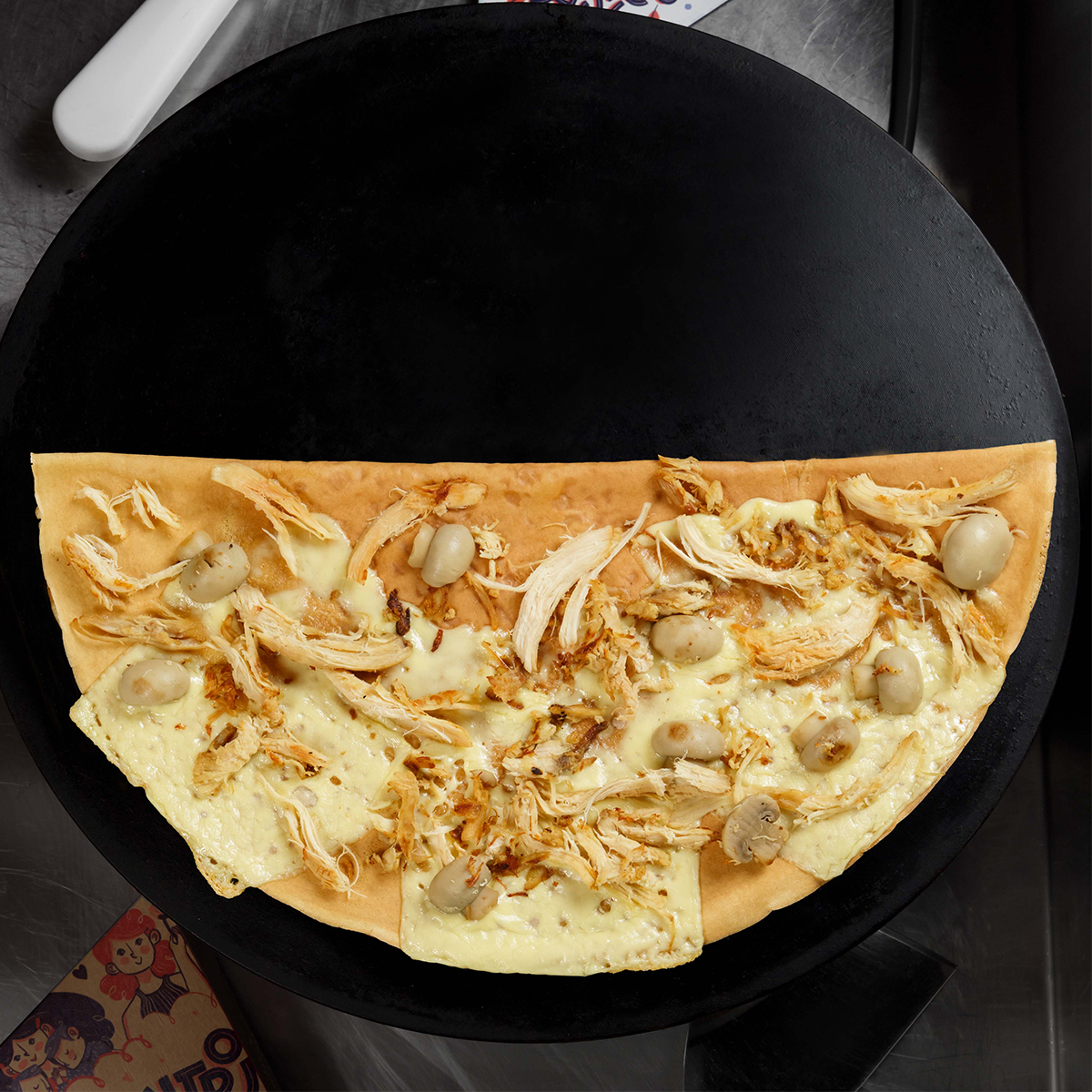 Crepe relleno con queso mozzarella, pollo marinado en salsa hoisin y champiñones.