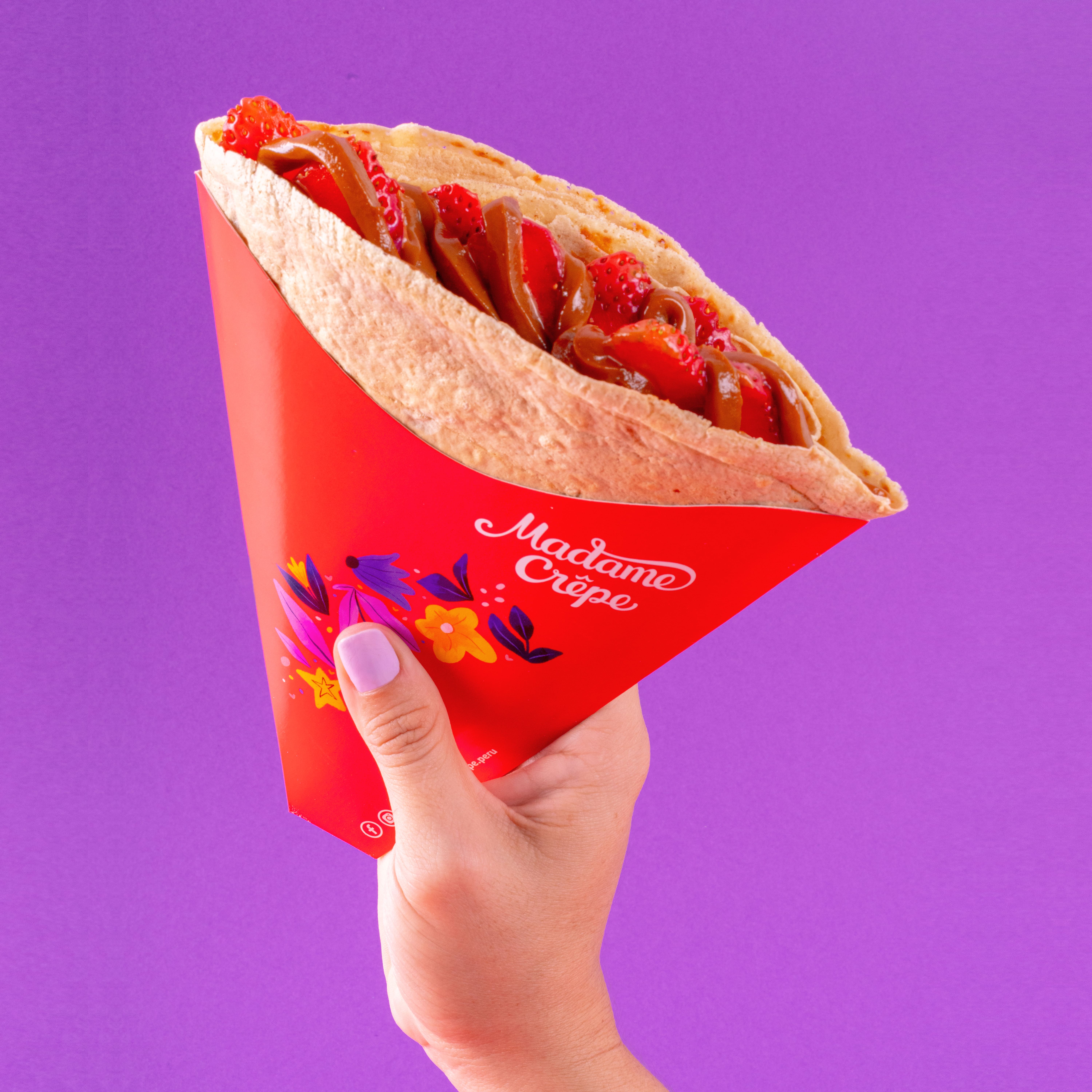 Crepe relleno con manjar, 2 frutas, bola de helado de vainilla y topping a elección.