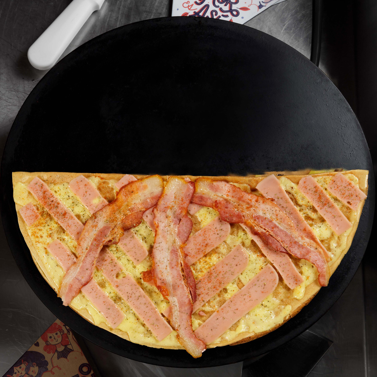 Crepe relleno con queso mozzarella, jamón pizza y tocino ahumado.