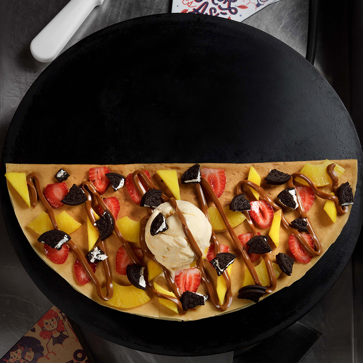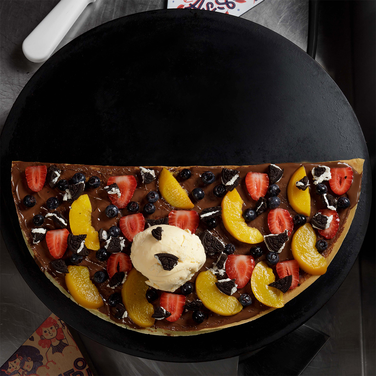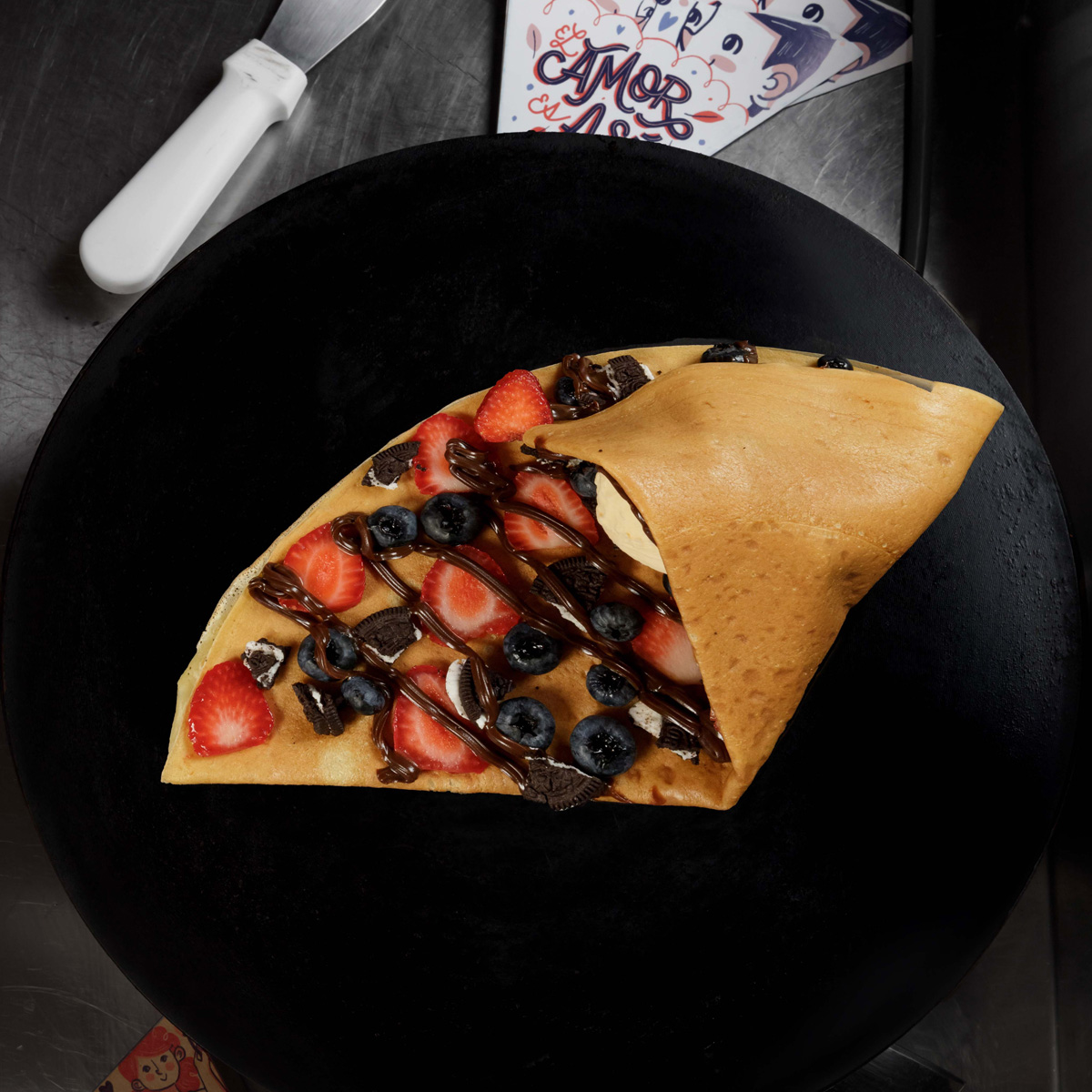 Crepe relleno con Nutella, fresa, durazno, arándano, Oreo y helado.