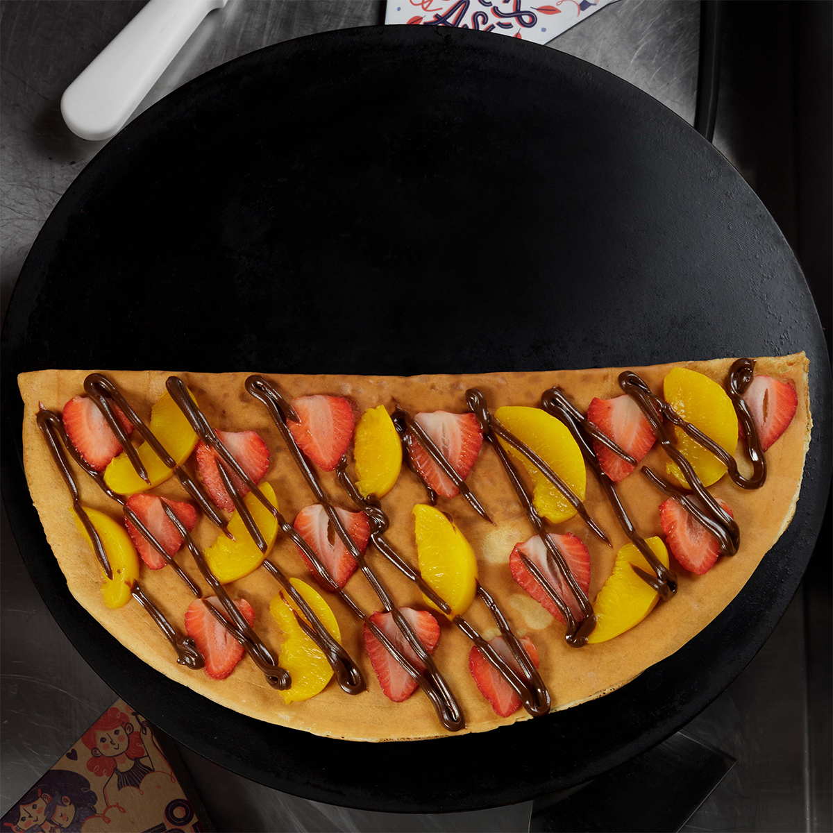 Crepe relleno con Nutella, 2 frutas, bola de helado de vainilla y topping a elección.