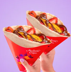 Crepe relleno con fudge, 2 frutas, bola de helado de vainilla y topping a elección.
