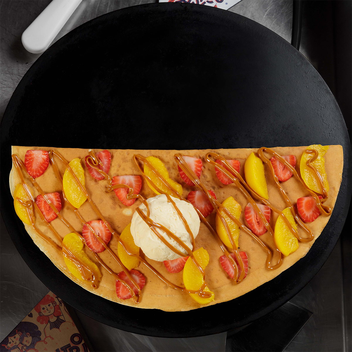 Crepe relleno con manjar, 2 frutas, bola de helado de vainilla y topping a elección.