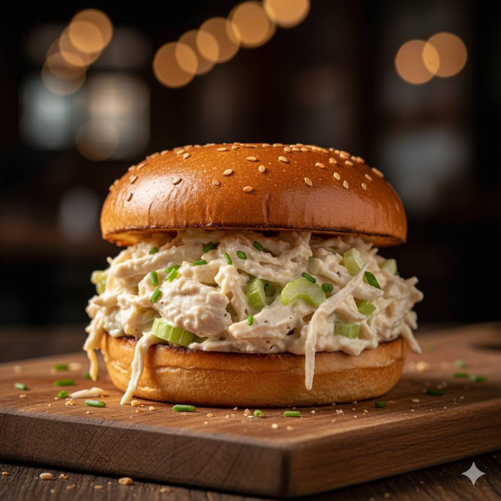 Pan de hamburguesa de la casa con relleno de pollo, apio, papas al hilo y lechuga.