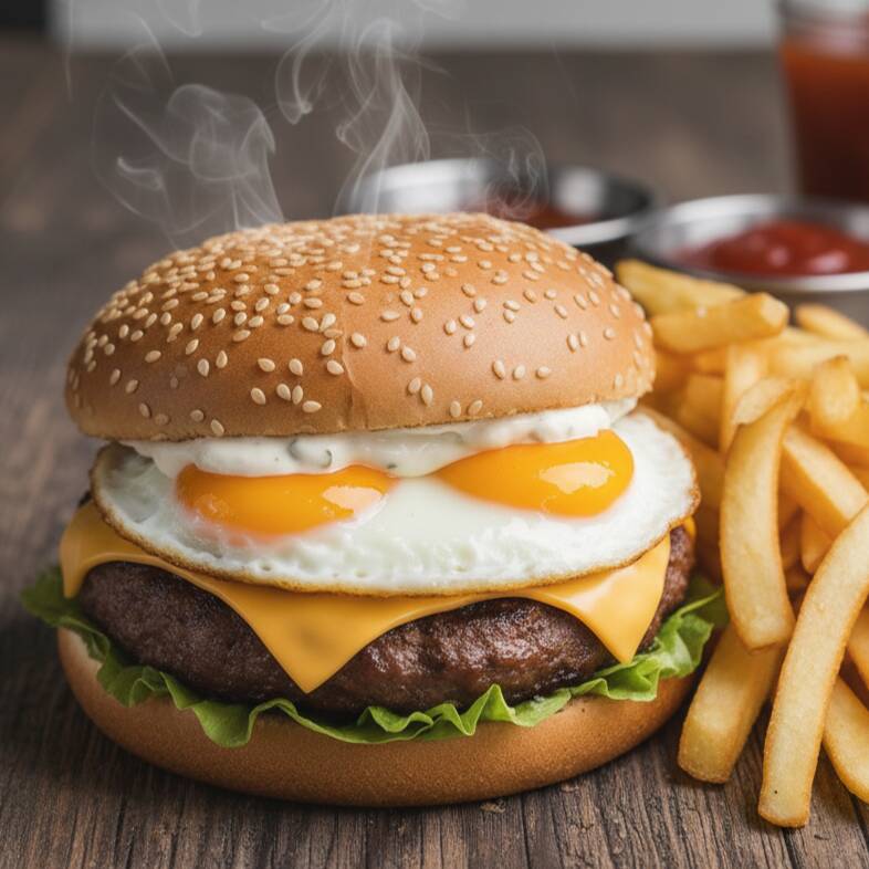Pan hamburguesa especial, carne, doble queso, lechuga, tomate, huevo, salsa maffy y papas fritas