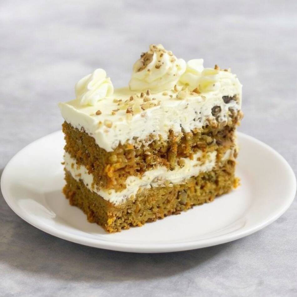 Cake de zanahoria con pecanas, decorado y relleno de frosting de queso crema. Decorado con pecanas troceadas.