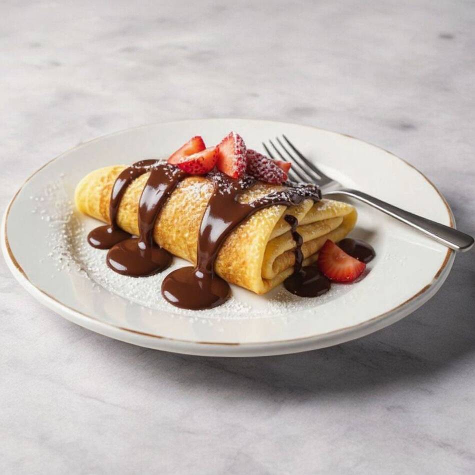 Crepe de la casa acompañado de fresa, fudge y azúcar impalpable.