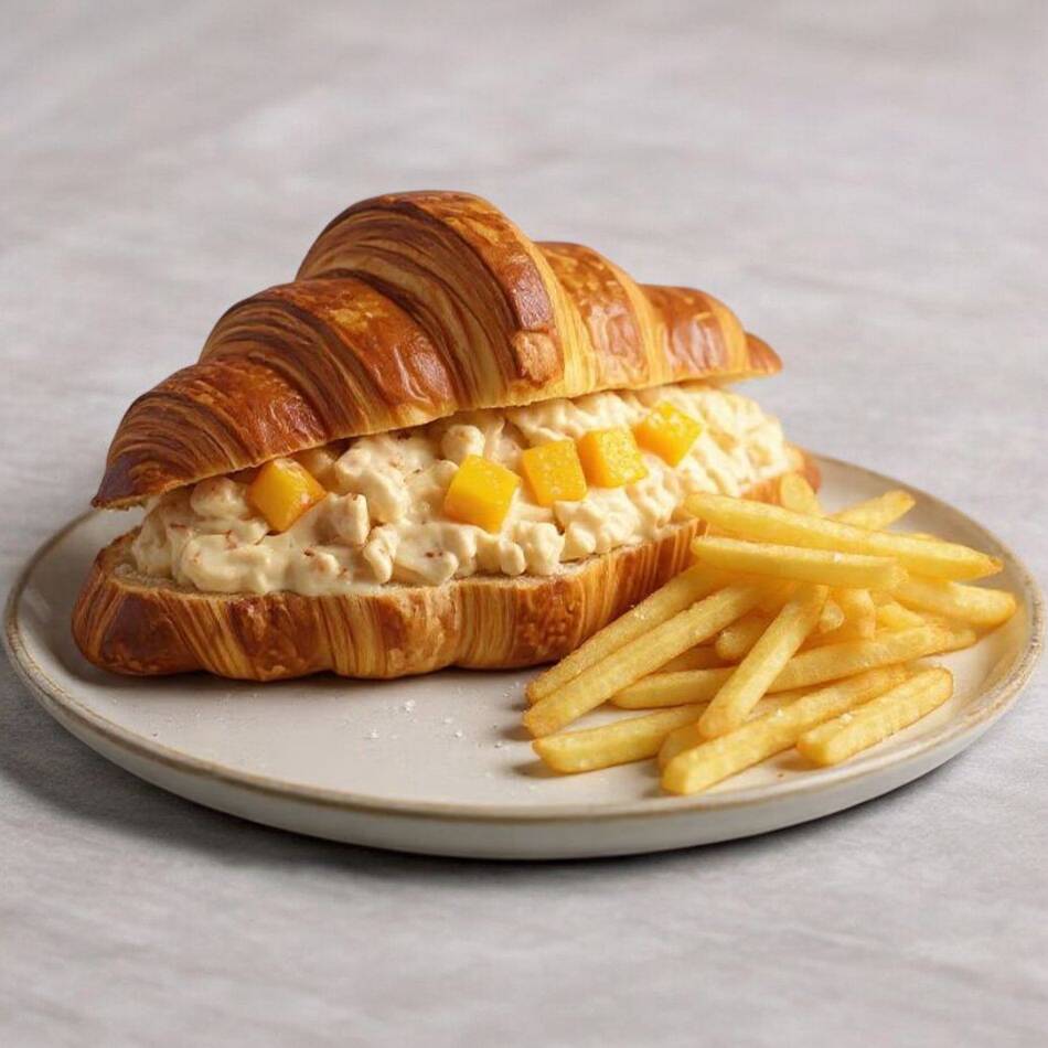 Croissant de pollo con durazno, acompañado de papas fritas.
