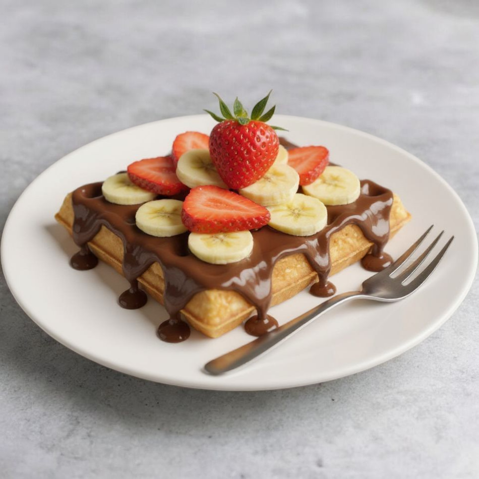 Wafle de la casa con Nutella acompañado de fresa, plátano y azúcar impalpable.