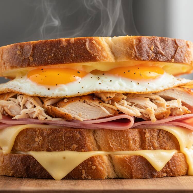 Sándwich con relleno de pollo, jamón, queso, lechuga, huevo y tocino.