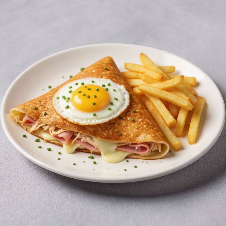 Sándwich en pan pullman con relleno de pollo, jamón, queso, huevo y acompañado de papas fritas.