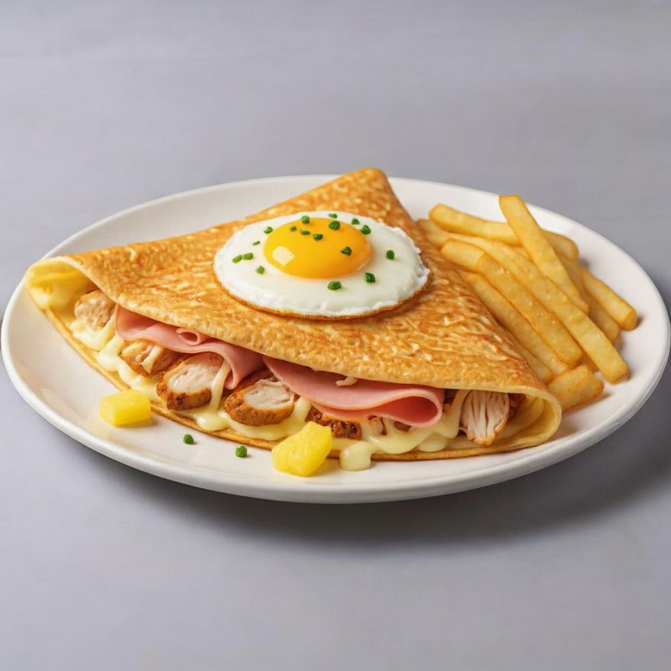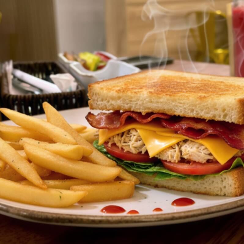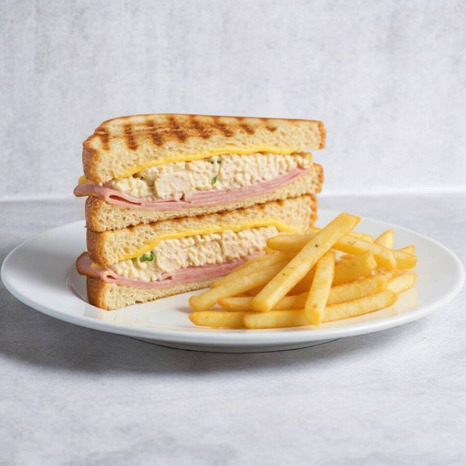 Sándwich triple con relleno de pollo, jamón, queso y papas fritas.