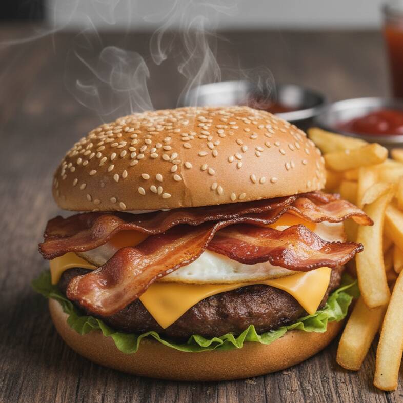 Pan hamburguesa especial, 150gr de carne, tocino, huevo, jamón, queso, tomate, salsa Maffy y papas fritas