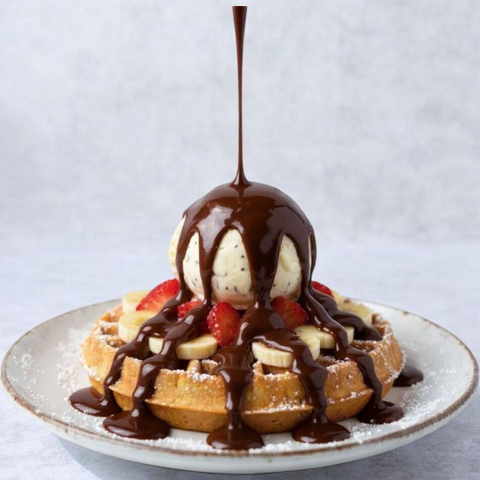 Waffle de la casa acompañado de fudge, fresa, plátano. helado y azúcar impalpable.