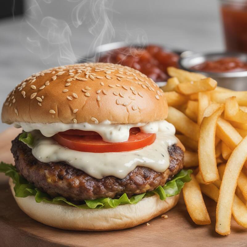 Pan hamburguesa especial, 150 g de carne, lechuga, tomate, queso, salsa maffy y papas fritas.