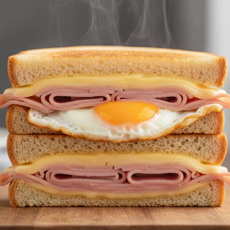 Pan pullman tostado con relleno de jamón, queso, huevo y gratinado con queso y finos toques de orégano.