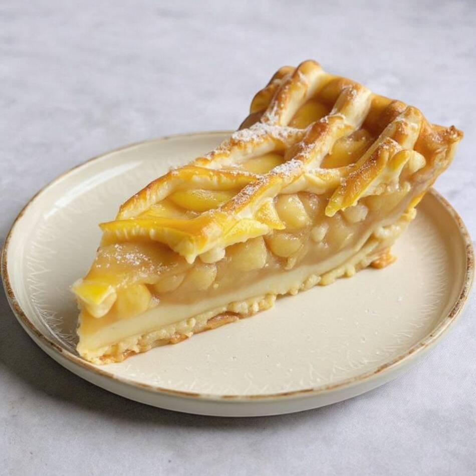 Pie de manzana con masa dorada y crujiente, porción individual.