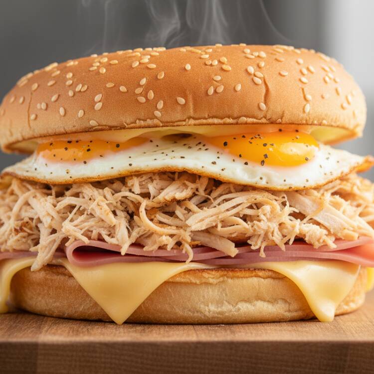 Sándwich en pan hamburguesa con relleno de pollo, jamón, queso y huevo.