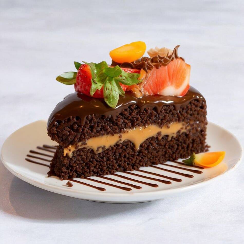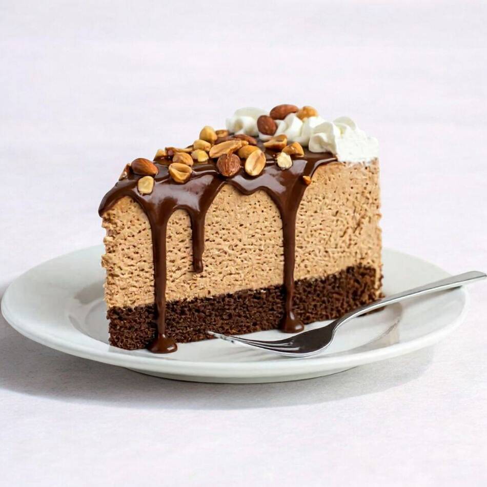 Mousse de chocolate con base y relleno de cake de chocolate Maffy. Bañado en chocolate derrito con pecanas troceadas.