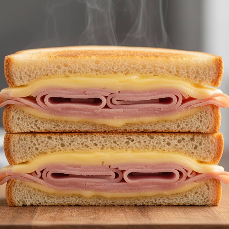 Pan pullman tostado con relleno de jamón, queso y gratinado en queso derretido con finos toques de orégano.