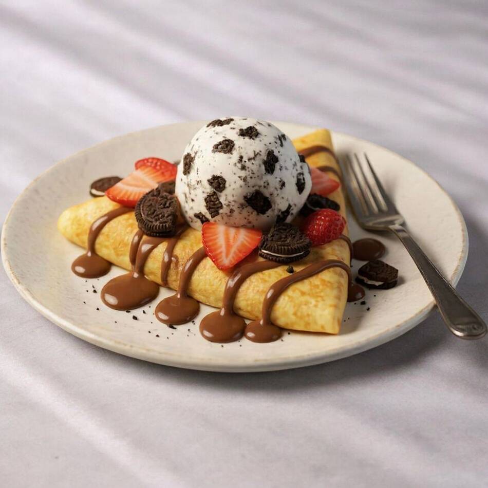 Crepe artesanal acompañado con fresa o plátano, helado, fudge y oreo.