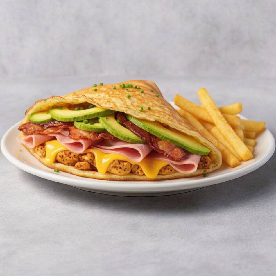 Sándwich artesanal a base de pan pullman, aguacate, jamón, queso, tocino, pollo y huevo.