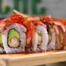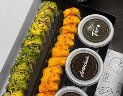 Shari, palta, pescado en salsa acevichada y langostinos furai.