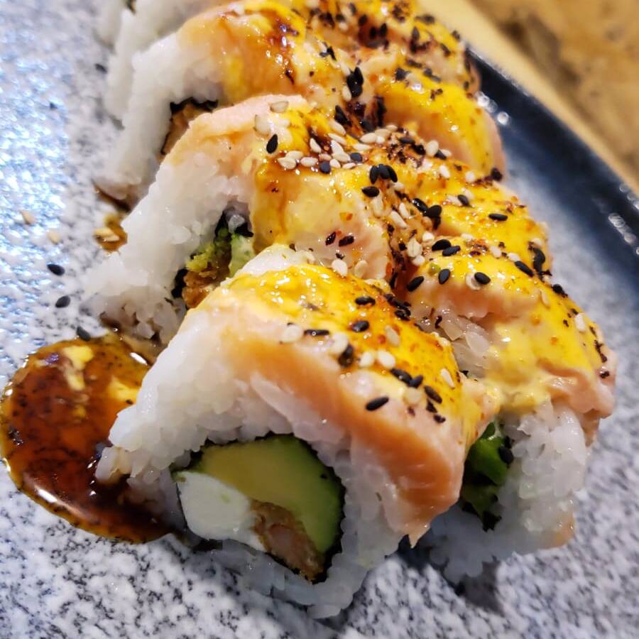 Maki relleno de queso crema, palta y ebi furai. Cubierto con trucha salmonada flameada, salsa spicy, tare, ajonjoli, togarashi, shizo, y gotas de limòn.