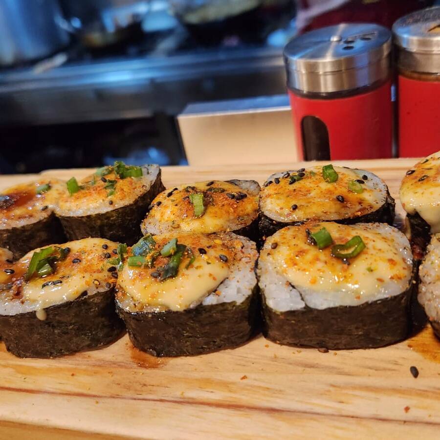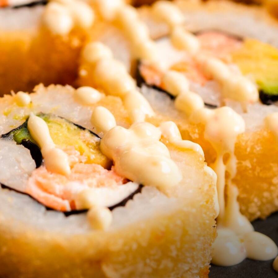 Maki relleno de palta y queso crema, nori por fuera, rebosado en tempura. Coronado con salsa ahumada, togarashi y negi.